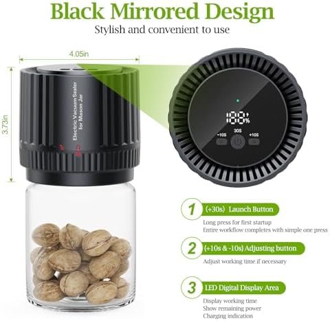 【Super solid sealing】Whether it’s nuts, fruit, salads, or sauces, you can use our vacuum sealer to preserve them. Quick and easy. Usually we recommend you set a sealing time of 30s. A successful sealing can keep the jar sealed super tightly for at least 2 weeks. Even if the jar is filled with liquid food, inverted and shaken, the seal will not come loose.