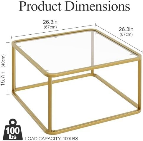 Item Dimensions: 26.4 x 26.4 x 15.7 Inches Material: Steel Frame & Tempered Glass Color: Gold Load Bearing: 100LB