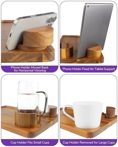 Couch Arm Tray Table with Cup Holder & Adjustable Phone Stand – Foldable Acacia