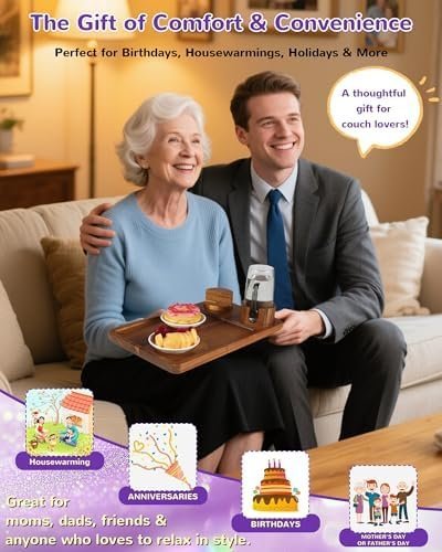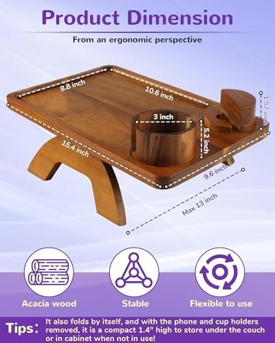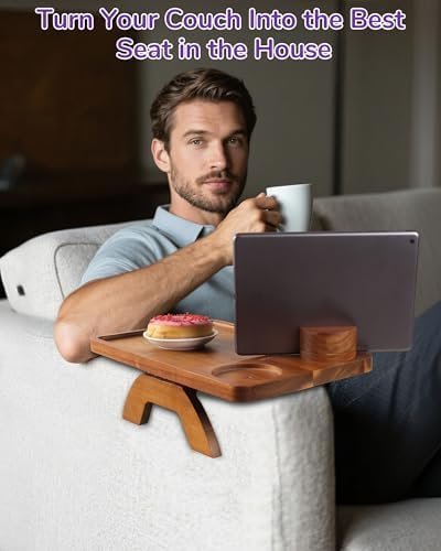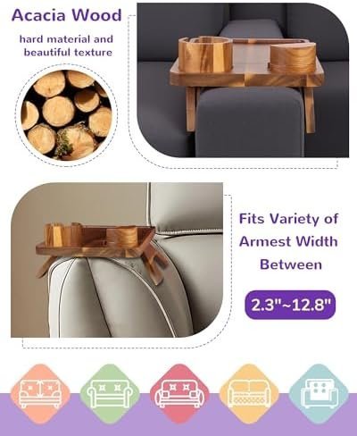 Fits Couch Arms Up to 12.8” Wide – No Tools Needed : Designed to fit armrests from 2.3″ to 12.8″ wide. No extra hardware required—just clip and go. Stable on most couches and recliners.