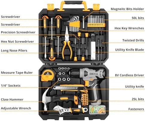 DEKOPRO Tool Set:Tool Kit with 8V Cordless Drill,Tool Box with Drill,Hand Drill