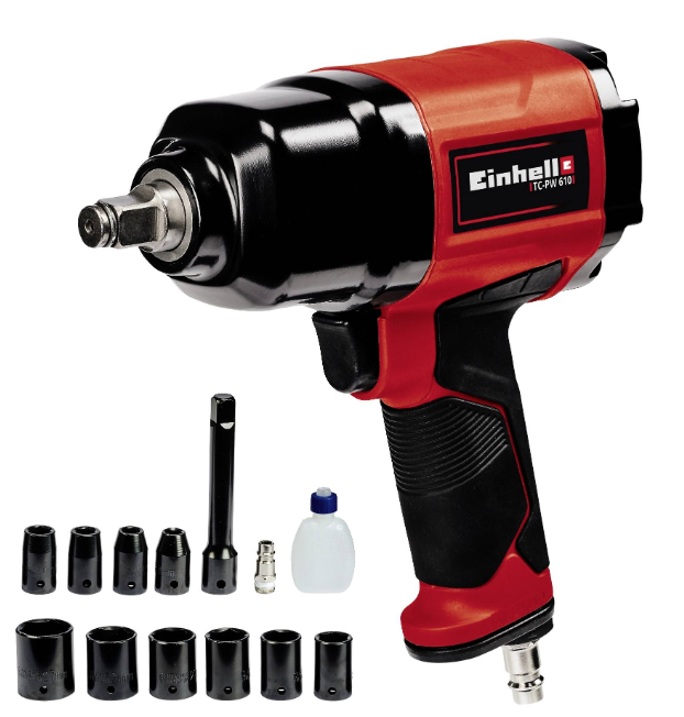 The Einhell compressed air impact driver TC-PW 610 takes on the work in the home, workshop and garage powerfully. Thanks to its high performance, it is also ideally suited for demanding tasks. The robust impact driver has a maximum torque of 610 Nm. The non-slip rubberized grip ensures safe and pleasant working in any situation. Equipped with left (single-stage) and right-handed rotation (three-stage), the compressed-air impact driver presents itself to a variety of DIY and do-it-yourself applications. It offers best performance from an inner diameter of 9 millimeters. The maximum working pressure is 6.3 bar, the maximum thread size is 19 millimeters. The equipment includes 10 sockets in the sizes 8/10/11/13/17/19/21/22/24/27 millimeters as well as 1x oil bottles and 1x plug nipple. An extension of 125 mm is also available. The compressed air impact driver TC-PW 610 from Einhell is immediately ready for use. Supplied in a practical transport and storage case.