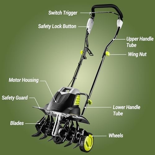 [POWERED BY ELECTRIC] Just plug in and start with the push of a button, easy to use. Space-saving design means easy storage in your shed or garage. Keep your 18-inch yard tiller within reach and ready to go whenever you are