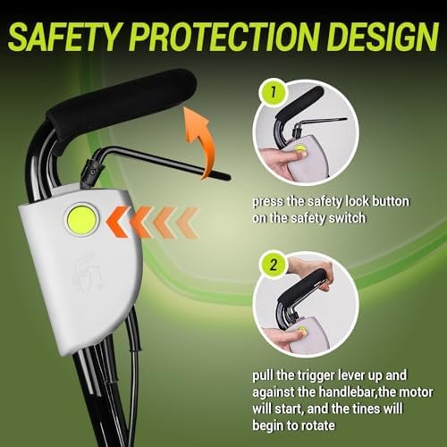 [SAFETY DESIGN] In order to ensure users’ maximum safety, the DEKO cordled small tiller cultivator comes with a safety switch. Only when the safety button and the trigger of the garden cultivator are pressed simultaneously can the gardening tiller be activated. It ensures the safety of you and your loved ones. You can use it with peace of mind