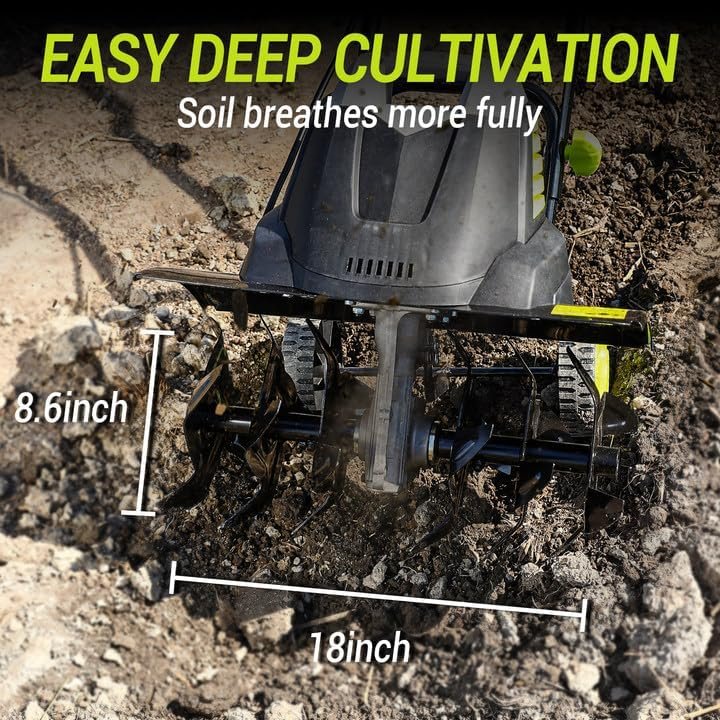 [TILLER CUTTING WIDTH 18-INCH] We have a 18-inch electric tiller for gardening that far exceeds the market’s average working width, electric tiller make your garden preparation a breeze and enjoy more time admiring your work. Tiller cultivator penetrate up to 8 inches deep into the soil, ensuring your plants get the nutrients they need from the ground up