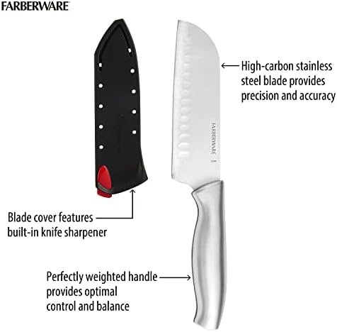 Always have the right knife on hand with this Farberware Self-Sharpening Stainless Steel 5-inch Santoku knife. This knife features a high-carbon stainless steel blade with kullens that prevents food from sticking to the blade while cutting. The knife is perfectly weighted for balance and control and features a stainless steel handle.The knife blade is expertly crafted from superior quality, high-carbon stainless steel, which ensures the blades retain their ultra-sharp edge longer than conventional stainless steel. This knife features a built in sharpener, which sharpens blade edge with every use. The sleeve keeps blade edge secure while knife is not in use. Includes: 5-inch Santoku knife with sheath. Hand-wash knives with warm water and a mild detergent then rinse and dry immediately. Stainless steel knives are not dishwasher safe.