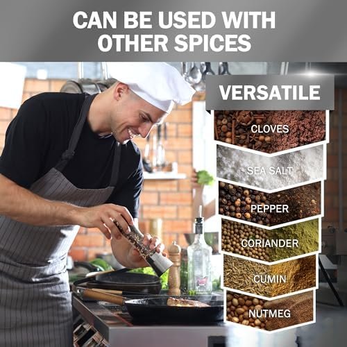 Stainless Steel Lid Caps = Fresh Spices & Clean Counters : Our tightly sealed stainless steel lid keeps your Himalayan sea salt, peppercorn medley, & spices fresh and long lasting by keeping out moisture. The salt and pepper grinders have the grinding mechanism on the top of the shakers, ensuring salt and pepper ends up only on your food, not all over your table or counter.