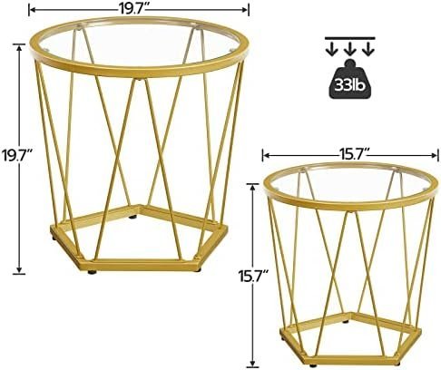 Color Gold Material Iron, Tempered Glass Product Size 19.7″L x 19.7″W x 19.7″H /15.7″L x 15.7″W x 15.7″H Package Contents 2 x Round Coffee Table; 1 x Accessory Kit; 1 x Instructions