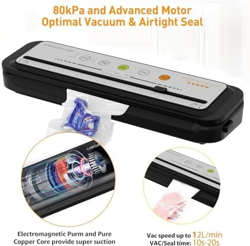 80kpa Suction Power – Updated vacuum sealer uses a DC motor pump with electromagnetic perm and pure copper core to enhance its suction power. It sucks all air out tightly to preserve your meat and vegetables for 10 times longer or more to prevent oxidation