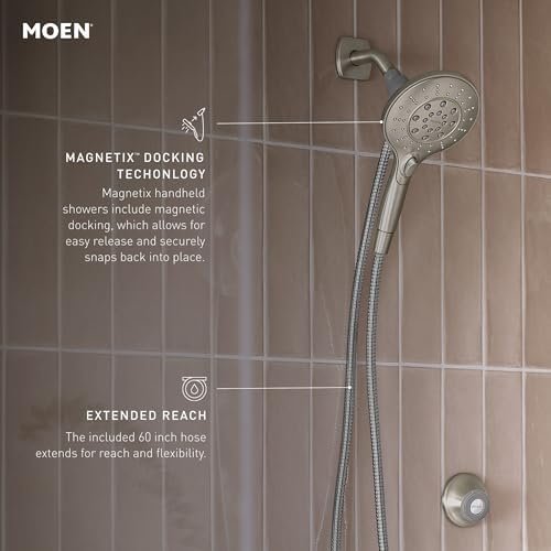 Upgrade your bathroom with the Moen Engage Magnetix Showerhead, a stylish and functional brushed nickel showerhead designed for a luxurious shower experience. Featuring a Spot ResistTM Brushed Nickel finish, this high-quality showerhead resists fingerprints and water spots, keeping your bathroom looking clean and polished. The 5.5-inch handheld spray head delivers maximum water coverage and six adjustable spray settings, allowing you to switch easily between gentle rain, invigorating massage, or powerful rinse modes. The Magnetix® docking system ensures effortless one-handed release and secure reattachment, always docking forward to prevent water from splashing outside the shower. The kink-free metal hose provides extended reach and flexible use for rinsing, cleaning, and bathing pets or children. Perfect for modern bathroom upgrades, the Moen Engage Magnetix showerhead combines style, performance, and convenience in one innovative handheld and wall-mounted solution. Transform your daily routine with a premium, high-pressure shower that’s easy to install and built to last.
