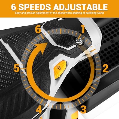 【SUPERIOR ADAPTABILITY】Electric orbital sander has 6 variable speeds and 16pcs sanding discs range from 60/80/120/240/400/1000 for coarse, medium and fine sanding, suitable for sanding or polishing wood and metal.