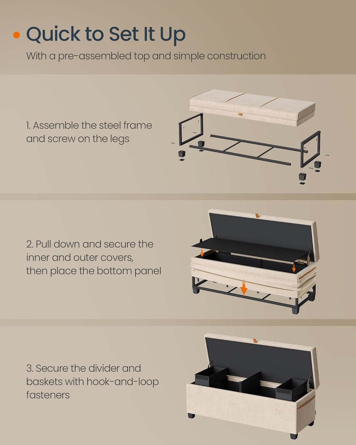 【GENEROUS STORAGE】This ottoman bench boasts an impressive 27-gallon (103 L) capacity, complete with a detachable divider and 2 removable baskets for flexible organization. The handy side pockets are perfect for neatly storing books or CDs