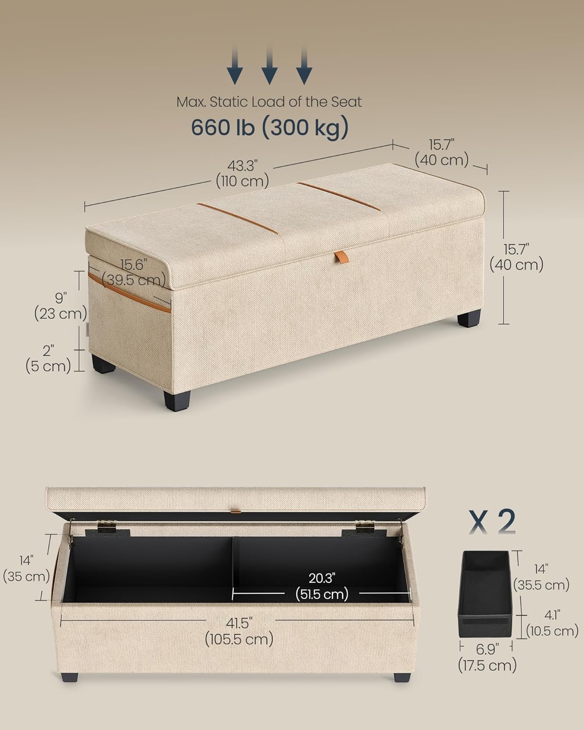 Color: Cappuccino Beige Material: Chenille, MDF (Medium Density Fiberboard), Steel, Foam Padding, Non-Woven Fabric Product Size: 15.7″D x 43.3″W x 15.7″H (40 x 110 x 40 cm) Product Weight: 26.2 lb (11.9 kg) Max. Static Load Capacity: 660 lb (300 kg) Volume: 27 Gal. (103 L)