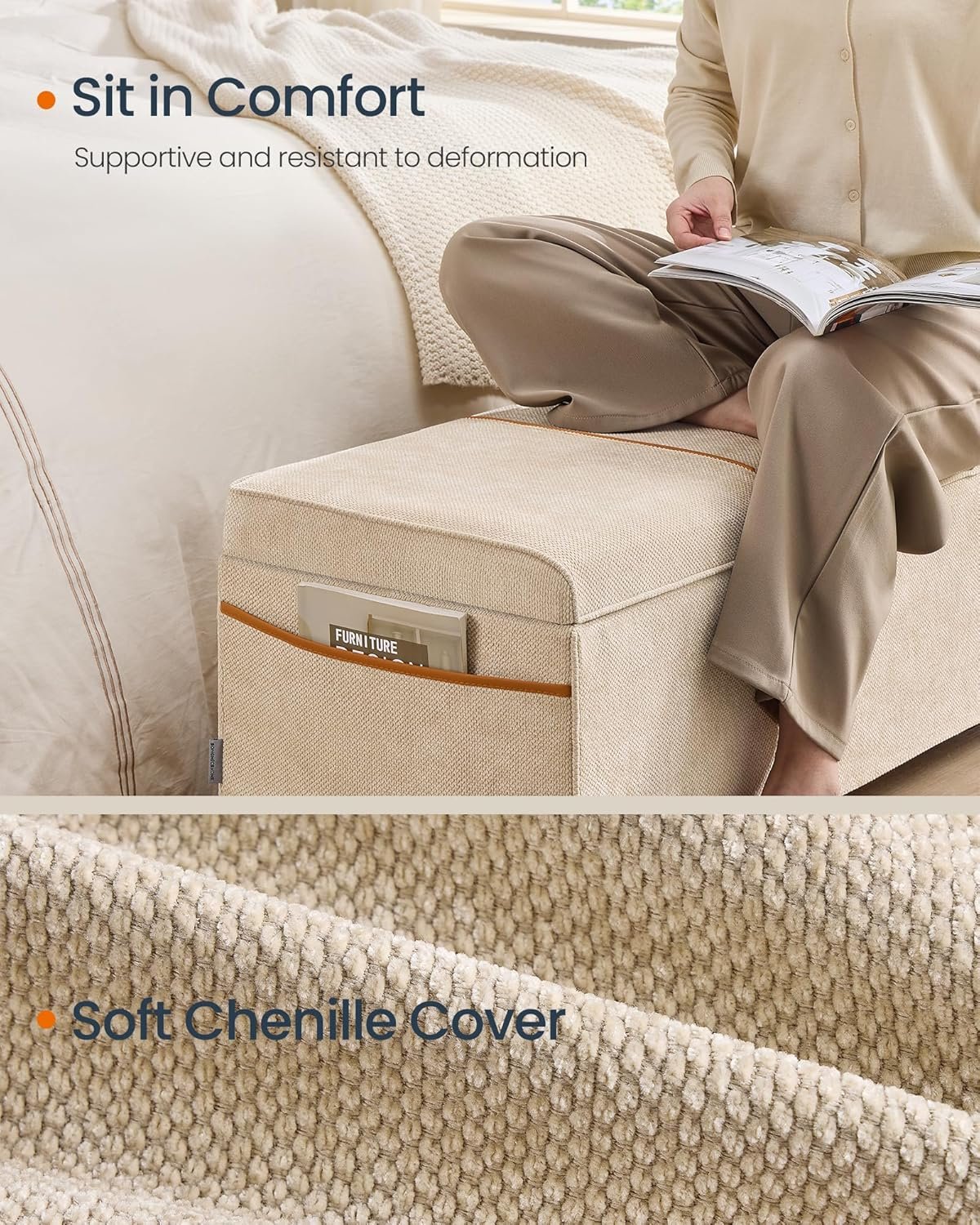【ELEGANT DESIGN, ENDURING COMFORT】This storage chest features a chic chenille surface accented with PU lines, bringing a stylish flair to your space. The 2-inch thick high-resilience foam padding ensures lasting comfort for relaxation