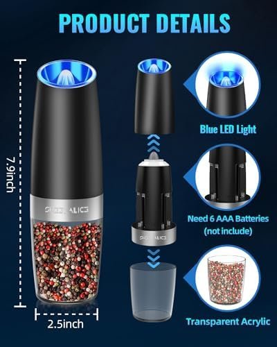 Sweet Alice Gravity Electric Pepper and Salt Grinder Set, Adjustable Coarseness
