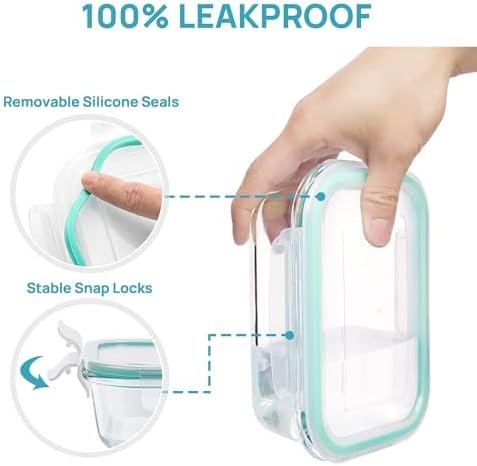 【100% Leak Proof Airtight Lid】Glass food containers is designed with removable silicone seals and 4-hinge snap locks to ensure zero leaking or spilling, which also prevent smell go out and keep food fresh.