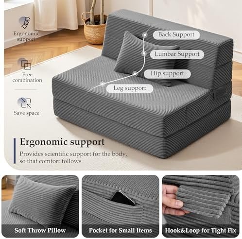 【Multi-Scene Use & Space-Efficient】Designed for small apartments, dorms, gaming rooms, or office lounges, this foldable sofa bed saves space while offering comfort. Features handy side pockets for remotes, magazines, or phones, plus a matching pillow.